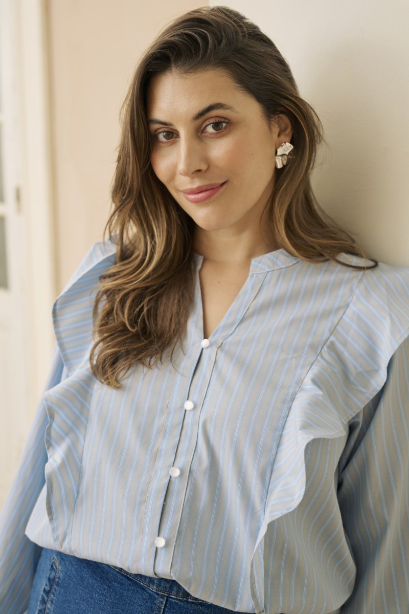 Риза с дълъг ръкавПредлага се в размери 42–54От марката Kaffe CurveИзработено от 65 % полиестер и 35 % памукСтандартна кройкаЦветът е синКликнете тук, за да видите ръководството за размери