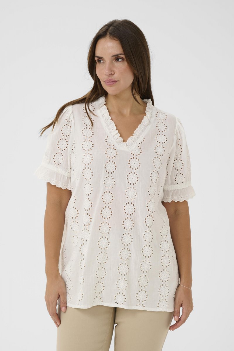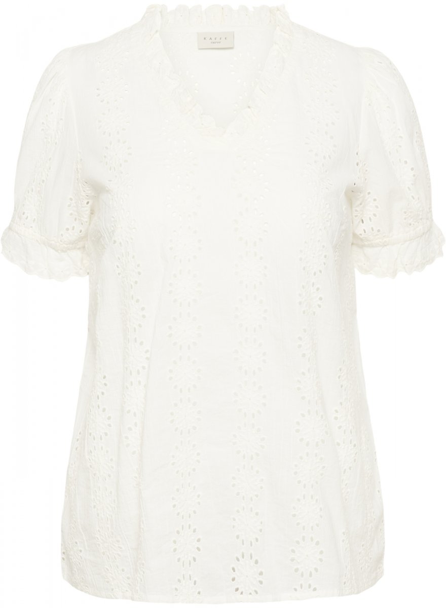 БлузаПредлага се в размери 42–54От марката Kaffe CurveПроизведено от 100% памукСтандартна кройкаЦветът е бялКликнете тук, за да видите ръководството за размери