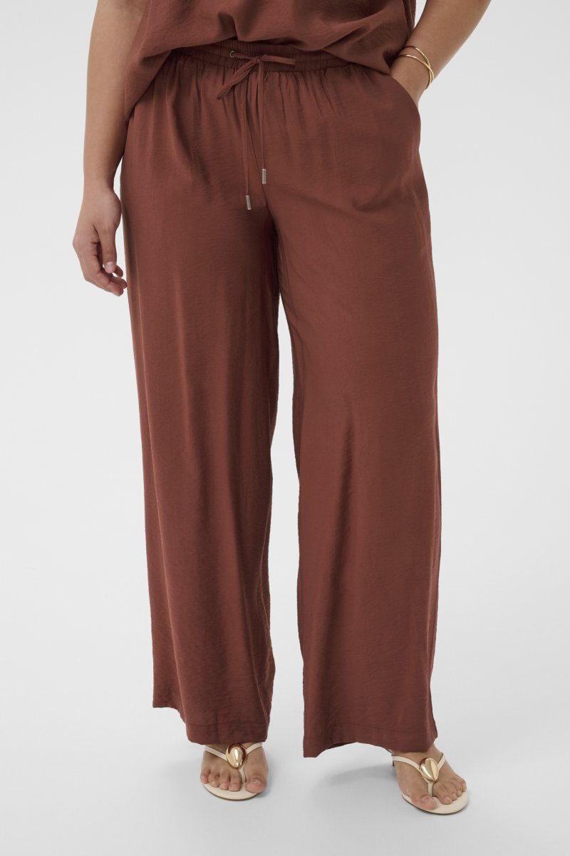 ПанталонПредлага се в размери 42–54От марката Kaffe CurveМатериал: 85 % вискоза, 15 % полиамидСвободна кройкаЦветът е кафявКликнете тук, за да видите ръководството за размери