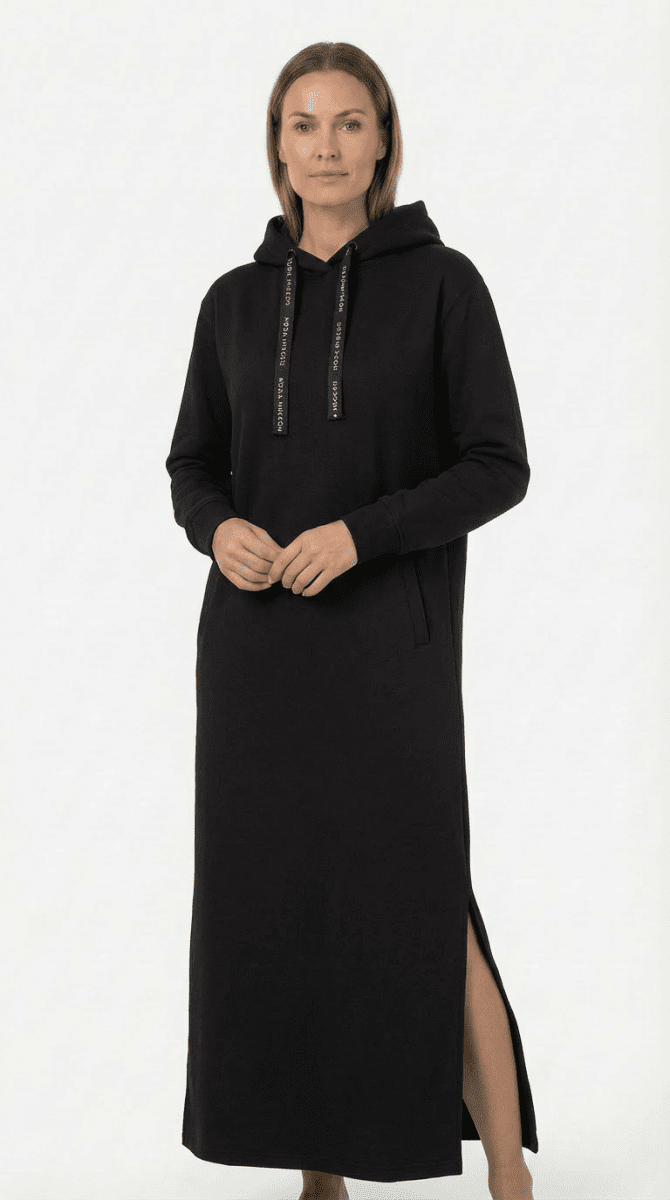 Дълъг суичър за жениНаличен в размери S-XXLОт марката Nora MikkenИзработено от 60% памук, 40% полиестерMaxiЦветът е черенХудито е с 2 предни джобаКликнете тук, за да видите ръководството за размери